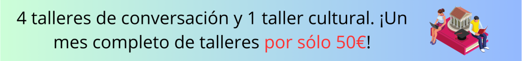 Un paquete con todos nuestros talleres a precio reducido (4 talleres de conversación y 1 cultural). ¿Quién dijo que para estudiar español de forma inmersiva había que estar en España? (este paquete está incluido de manera gratuita en los grupos y en los alumnos con paquetes mensuales de clases)